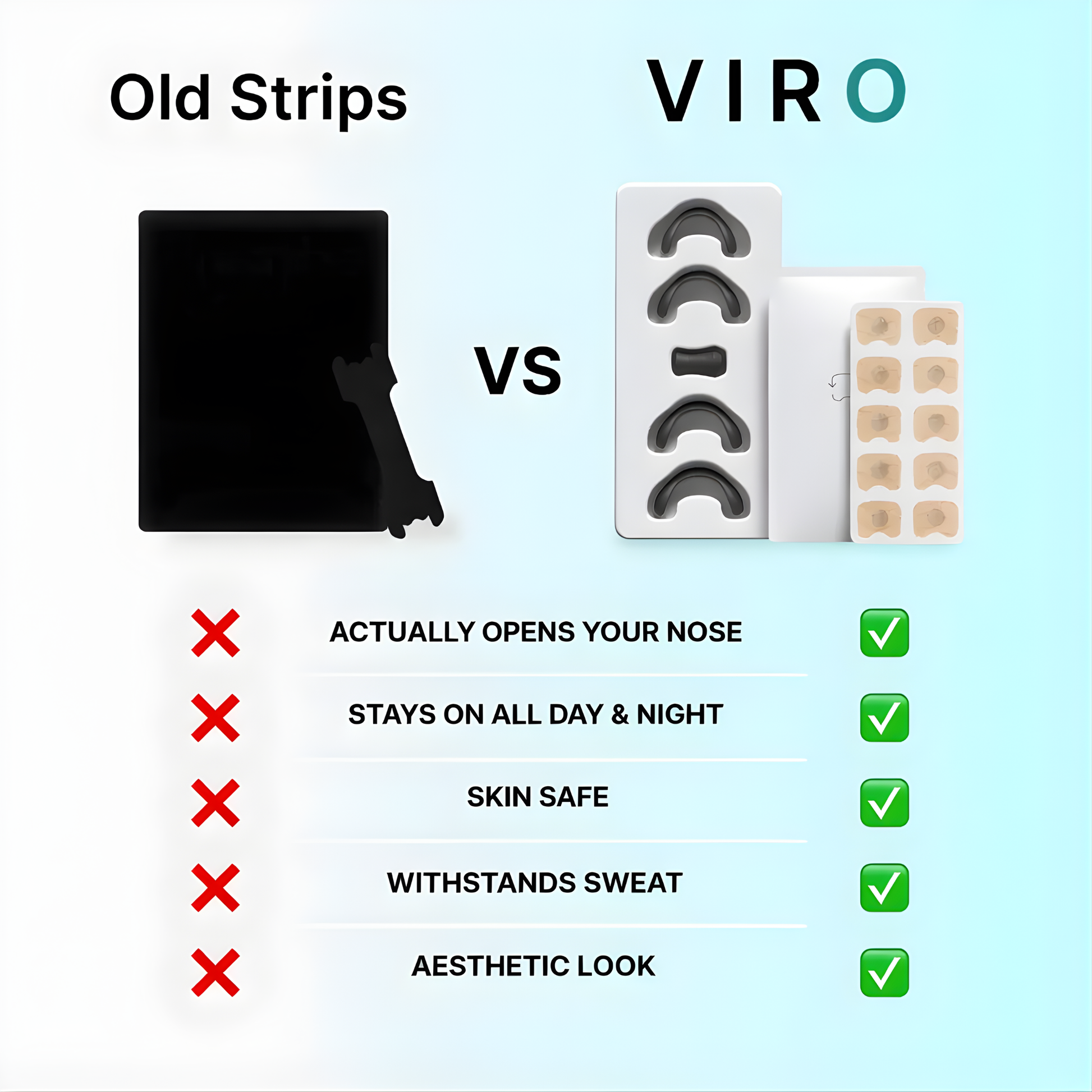 VIRO opens your nose for real — not just sticks on. It stays secure, sweat-proof, and reusable, unlike standard nose strips that slip and lose effectiveness.